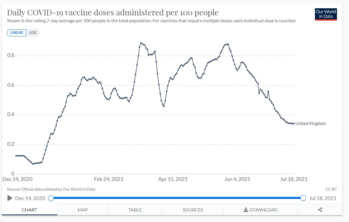 OK, here is one I made earlier (as they say) – a chart with deaths against total jabs.
