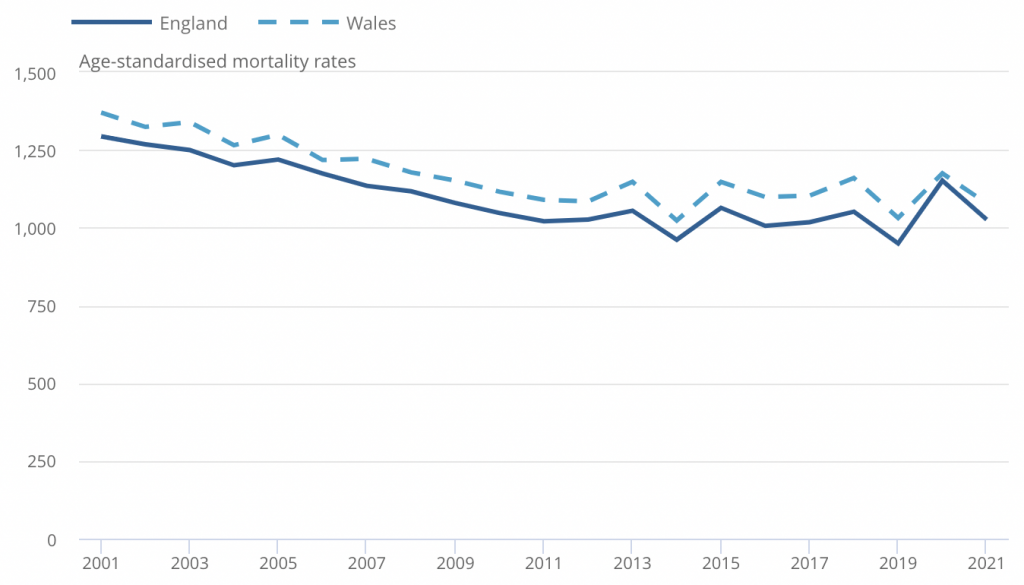 The age-standardized mortality rate for 2020 was 1043 (per 100,000) which was lower than every year up to 2008 (1091).
