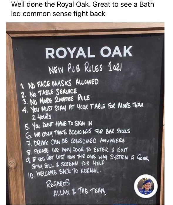 Someone showed me this picture of a sign outside the Royal Oak in Summerlays Place, Bath, this morning which speaks for itself.