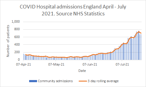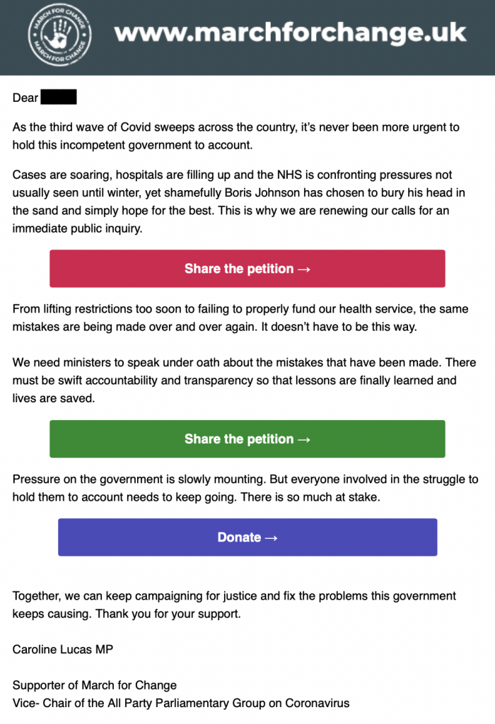 The odd thing about this email is that it appears to have been written a week ago since it makes no reference to the fact that the number of daily cases yesterday was 40% lower than it was on July 18th, the day before ‘Freedom Day’. By going ahead with ‘Freedom Day’, Caroline Lucas claims, the Prime Minister has “chosen to bury his head in the sand and simply hope for the best”. As a result of this criminal recklessness, “the third wave of Covid [is] sweep[ing] across the country”, she says, and”cases are soaring”.