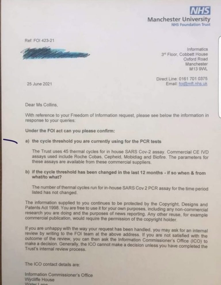 That is what I have seen with other FOI request responses. I also remember the WHO Gold Standard CT rate is set very high, perhaps 40? Kary Mullis went on record to disavow it’s use as a mass testing mechanism – and he should know, RIP. If you want to have a leitmotif for this entire fraudulent scandal is the knowledge that Governments know the RT PCR “Gold Standard” is not fit for purpose but these criminals still persist with their blatant lies.