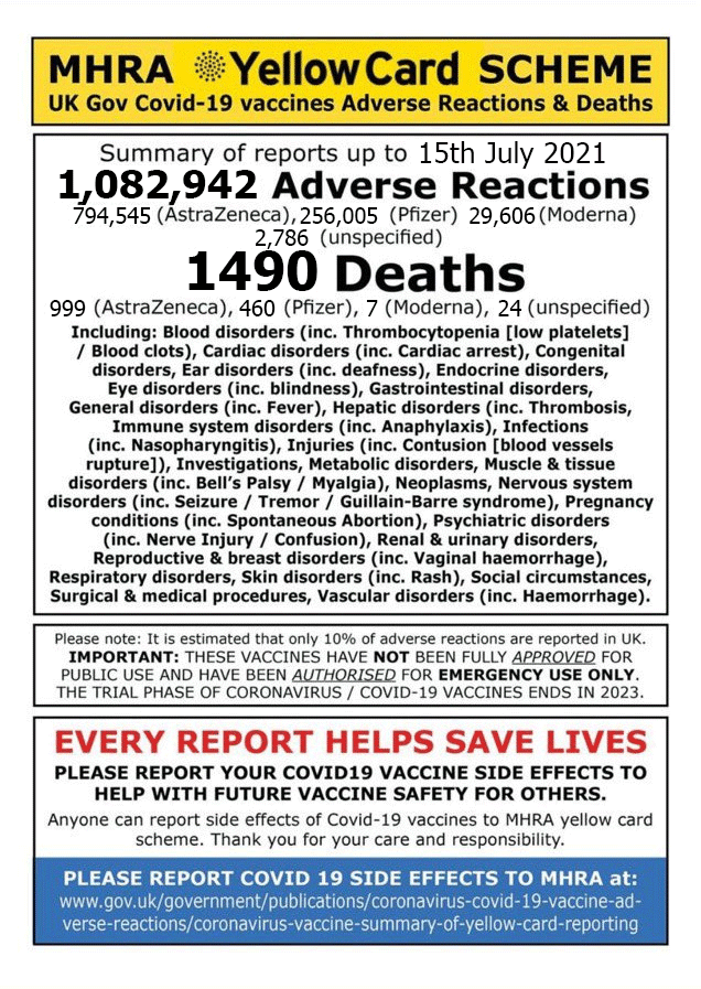 Yellow Card Reporting Data as of the 15th July 2021