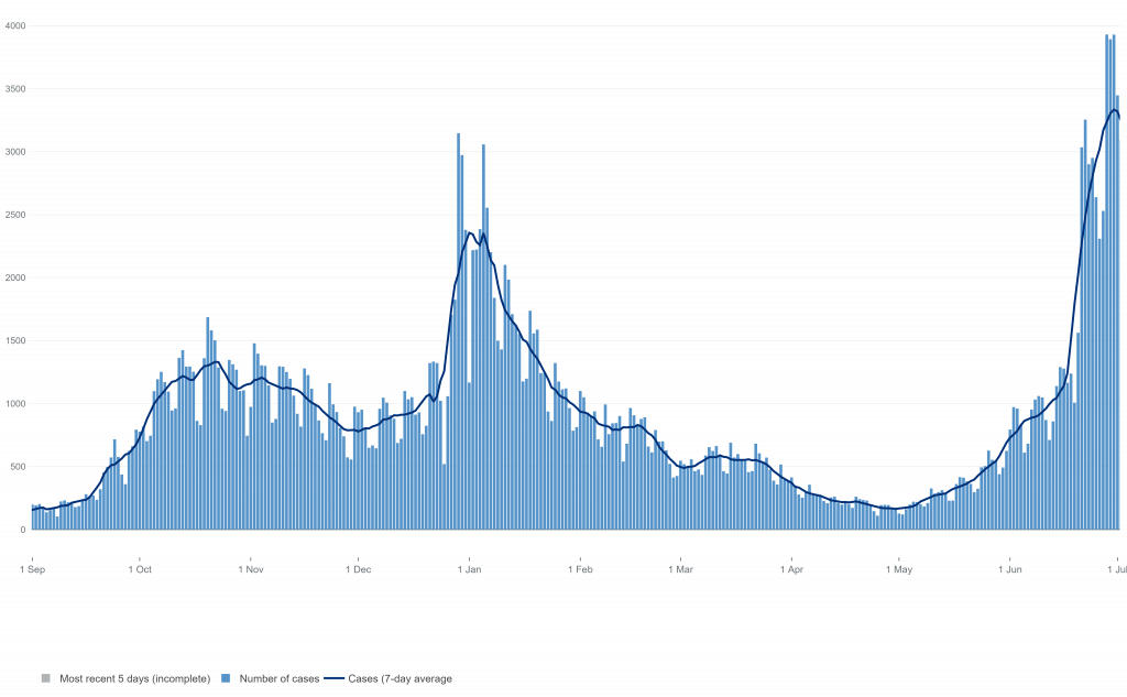 Scotland saw its daily ‘case’ count hit record highs on June 28th-30th following the team’s three games in the competition.