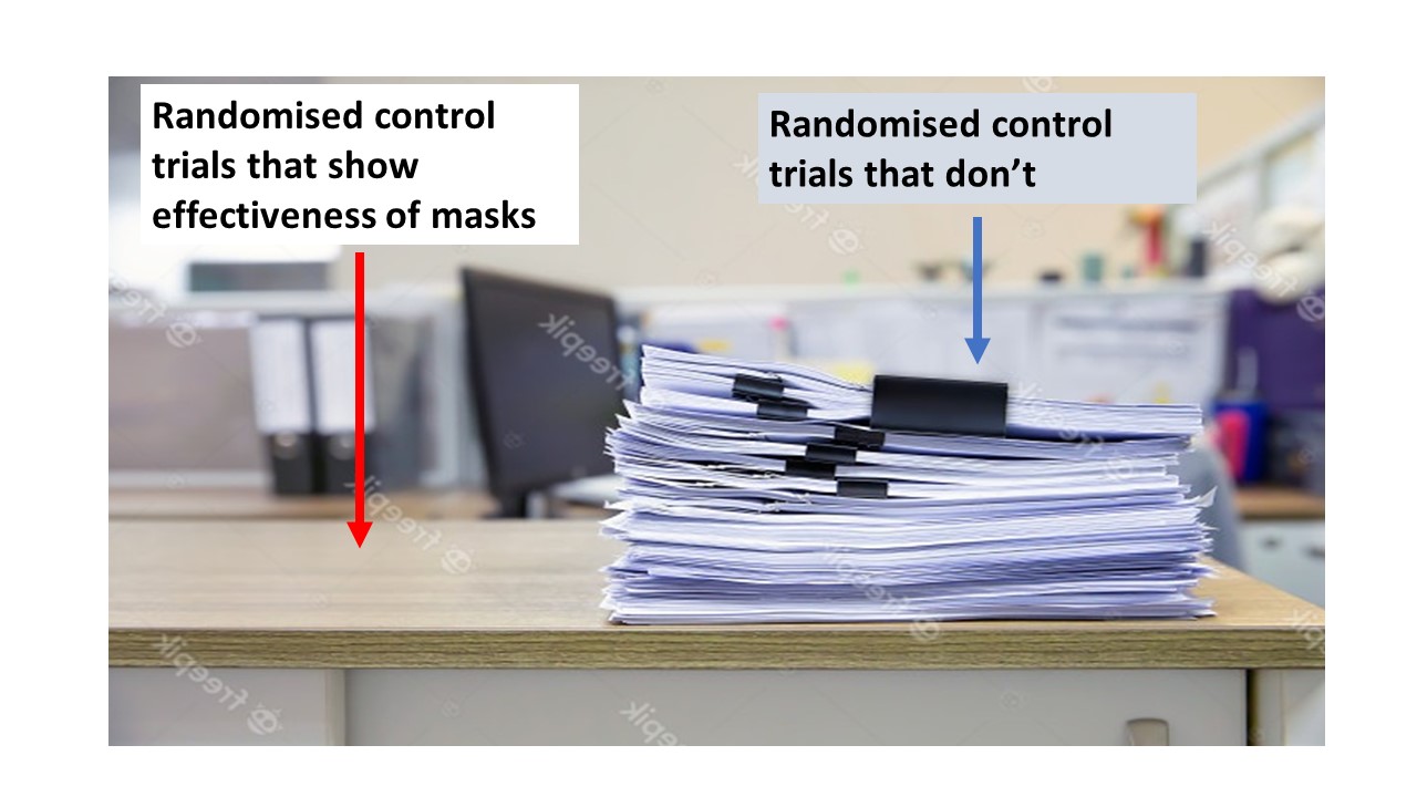I produced a meme that illustrates the point. It’s not great, but essentially, as far as I’m aware (and others have stated this too) there are dozens of RCT’s on mask wearing (surgical masks) that do not show any significant benefit to their use in terms of reducing infections – and none that do show any significant benefit