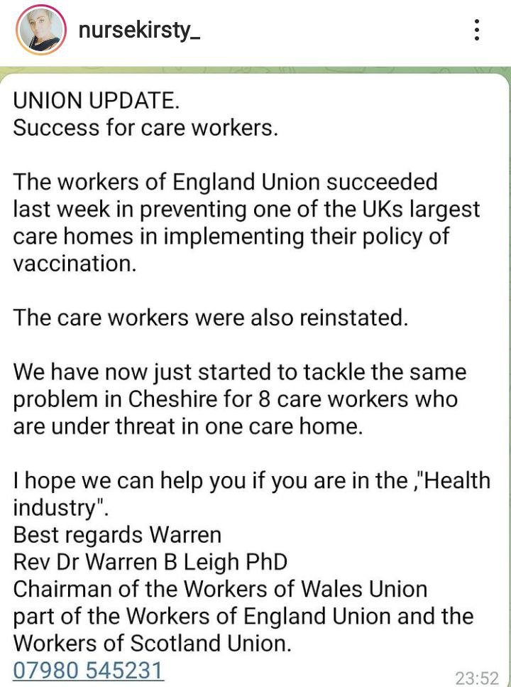 Unfortunately in the uk we are exactly three months (maximum statutory notice period) away from the implementation of the new law that will mandate jabs for workers in care homes. The reason for dismissal will simply change from non compliance with company policy to statutory bar. The trade unions aren’t doing anything about this.
