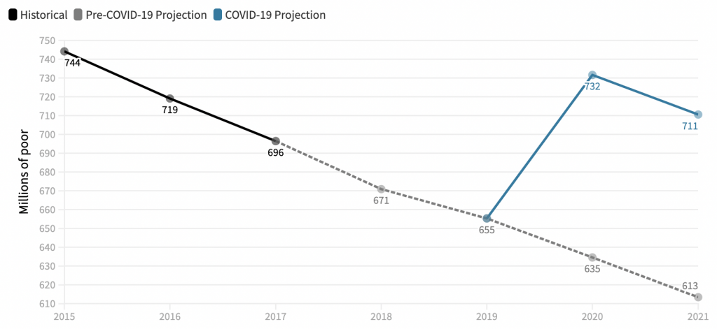 Using this method, World Bank researchers calculate that 97 million people fell into extreme poverty as a result of the pandemic. In the chart below, 97 million is equal to the difference between 732 million (the estimated number of people in extreme poverty) and 635 million (the expected number).
