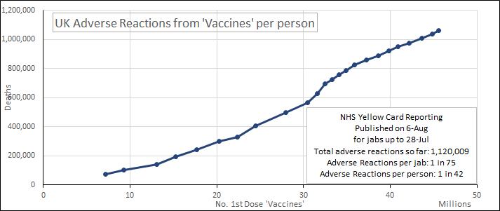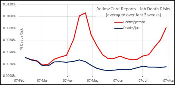 Assuming that the Yellow Card Reports are related to the jabs, the ‘death risk’ per person is currently 0.008% from my first chart. Now look at the attached.