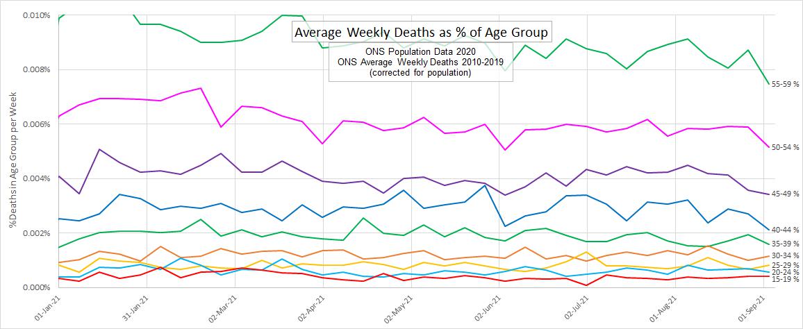 It is surprisingly consistent. I would not have expected it. Here is a chart of deaths against 1st jabs (which represents total people). From 35 million jabs (beginning of May onwards), the death rate is constant, even though the ages reduce.