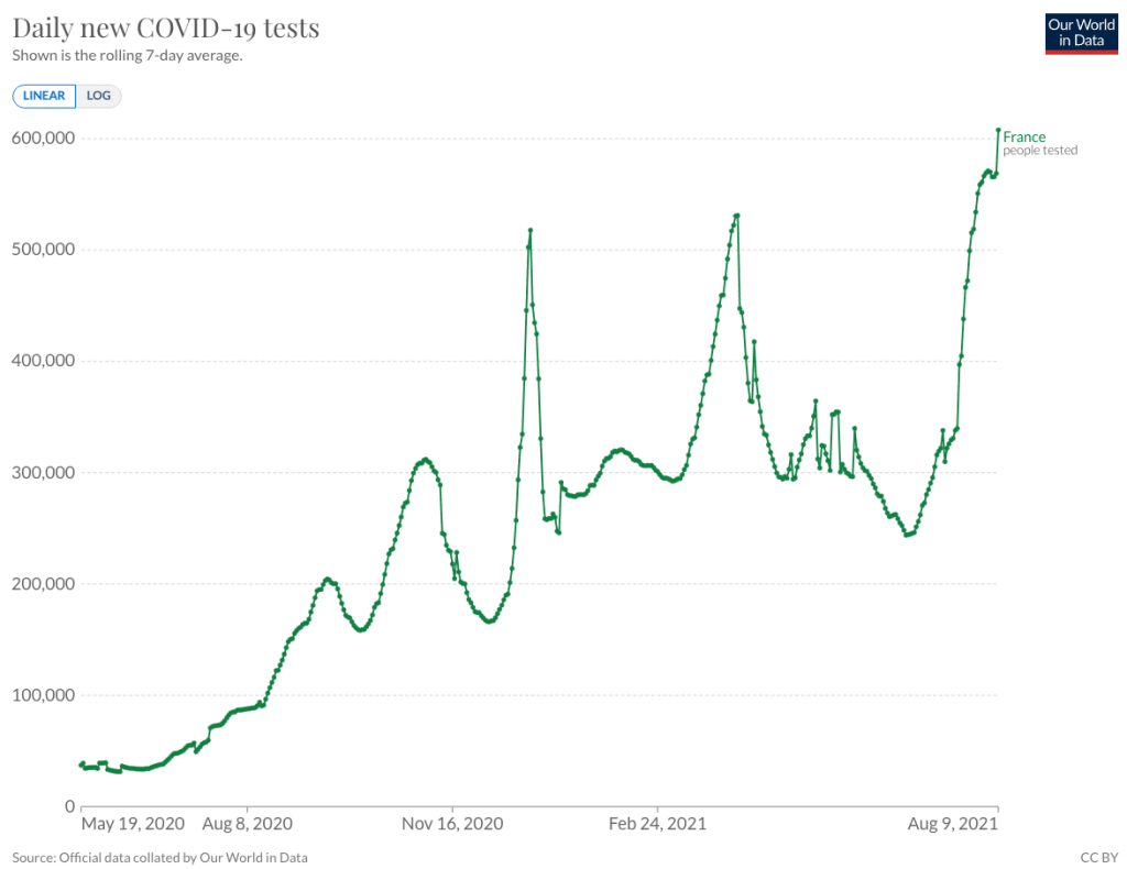 Finally, not for the first time, we must raise eyebrows at polling that paints a totally different picture of what people think than what is observable with our own eyes. Polling firms try hard to ensure their sample is representative, but it’s been known for many years that their samples are not genuinely reflective of the population under test. A large but very predictable problem is that polls massively over-represent volunteers. It seems likely that there’s a correlation between the sort of people who support the Pass Sanitaire and the sort of people who enthusiastically volunteer to spend time on surveys without compensation. In the past I’ve encountered a belief among (ex) professional pollsters that it’s an open secret in the business that any question with a “pro-social” answer will get wildly un-representative answers. However, I’ve never been able to find any kind of rigorous written discussion of this. If you work or have worked in polling and have some insight to offer here, please do get in touch and share it. Enquiring minds would like to learn more!