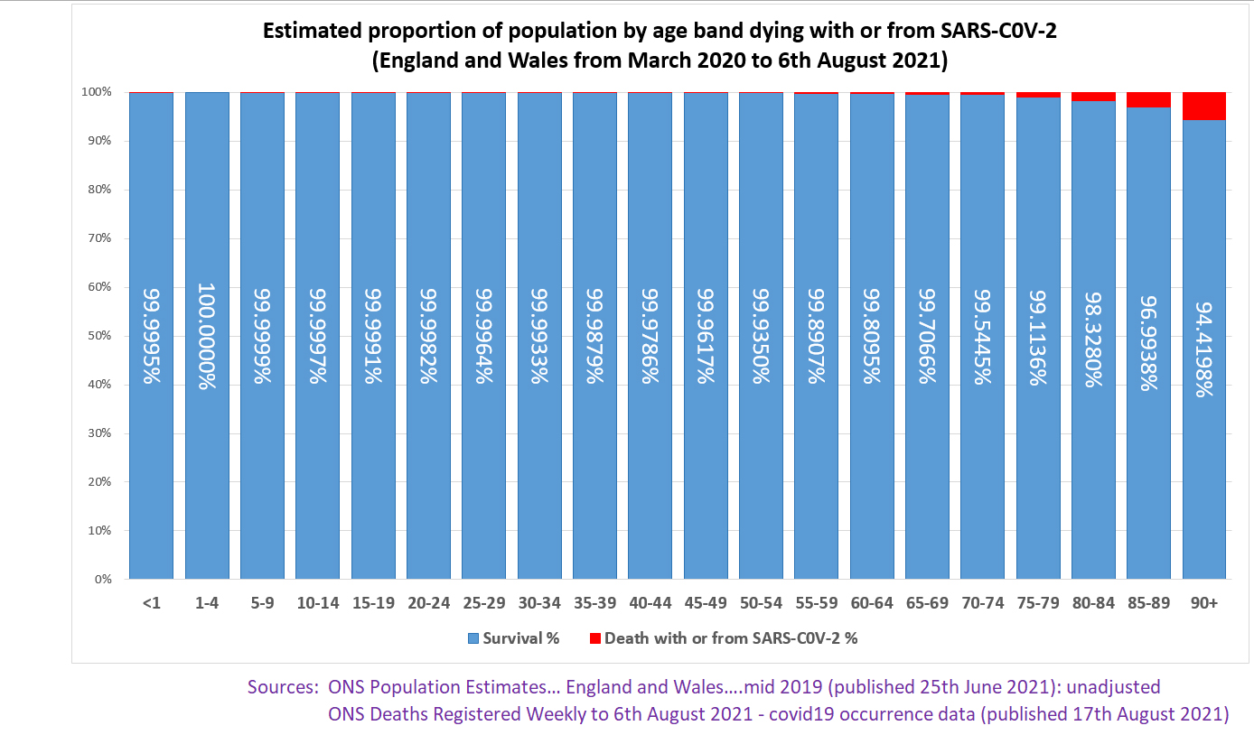 And here is my chart based on ONS data showing even in relation to deaths labelled with covid (a safe and effective vaccine if it existed could only prevent against deaths from covid) the survival rate for children is as near as you can get to 100%