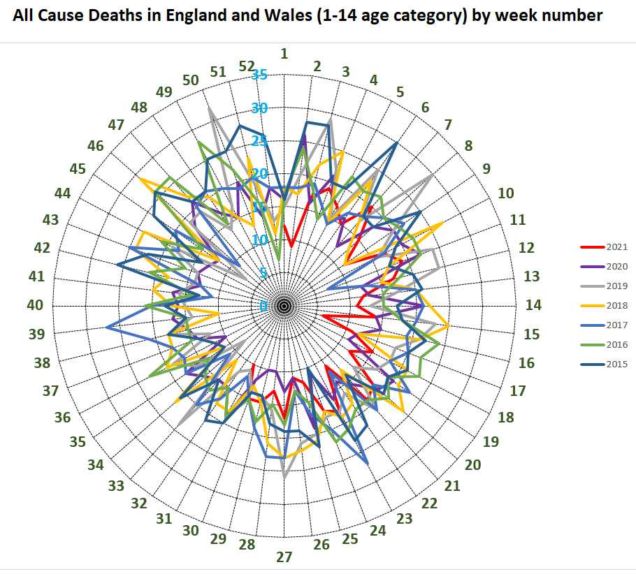 I agree the risk is essentially zero. Here’s some data to back that up based on all cause mortality in children rather than deaths labelled as covid. It’s a Florence Nightingale chart of all cause mortality for the age 1-14 age category (which overlaps with the age 12-14 age group in this Moderna ‘approval’) using death data from the weekly ONS publication and based on the Florence Nightingale data representation idea of CEBM. There is week to week variation in this age group because deaths are so few relative to older age groups, but you should still be able to see any covid mortality impact in this age group, if there was one; you can’t. Can you spot a single week since this all started in March 2020 when the number of all cause deaths in that week in this 1-14 age group were not higher in at least one same numbered week from 2015-2019. There might be one, but from a quick glance I’m struggling to see one. Does that not broadly suggest that covid has had no affect at all on the age 1-14 age group in terms of mortality impact? What does that tell you about the… Read more »