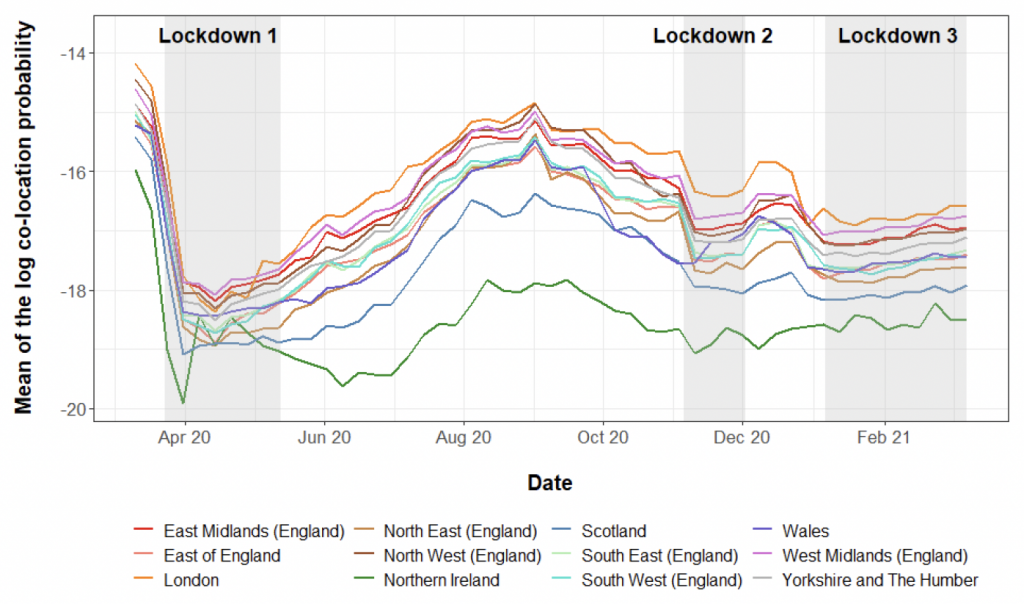 There was a dramatic decline in co-location probabilities in March, which largely preceded the first lockdown. There was a small decline during the second lockdown, and then another small decline during the third lockdown. (Note that the authors seem to have mislabelled the third lockdown, which began somewhat earlier than their shading indicates.)