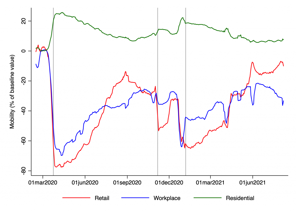 Looking at both charts, itās clear that mobility remained substantially below the baseline throughout 2020 and the first part of 2021, even during periods with relatively few restrictions in place. This suggests an important role for voluntary changes in behaviour.