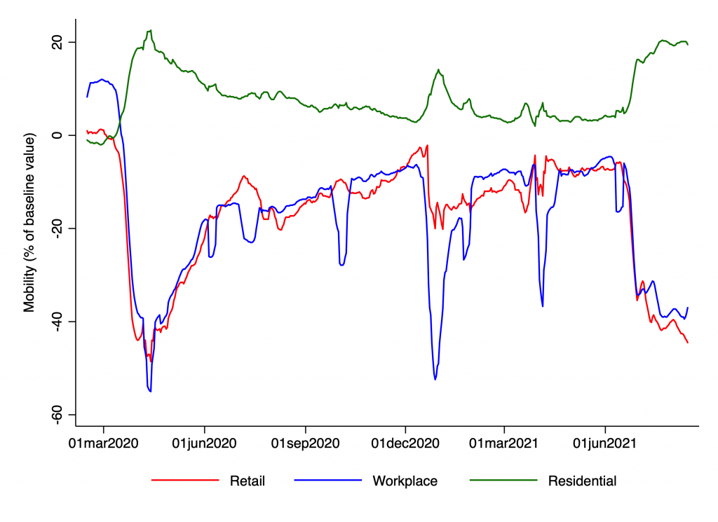 As the chart indicates, levels of retail and workplace mobility are now almost as low as they were at the start of the pandemic, when people in almost all Western countries stayed at home out of fear.