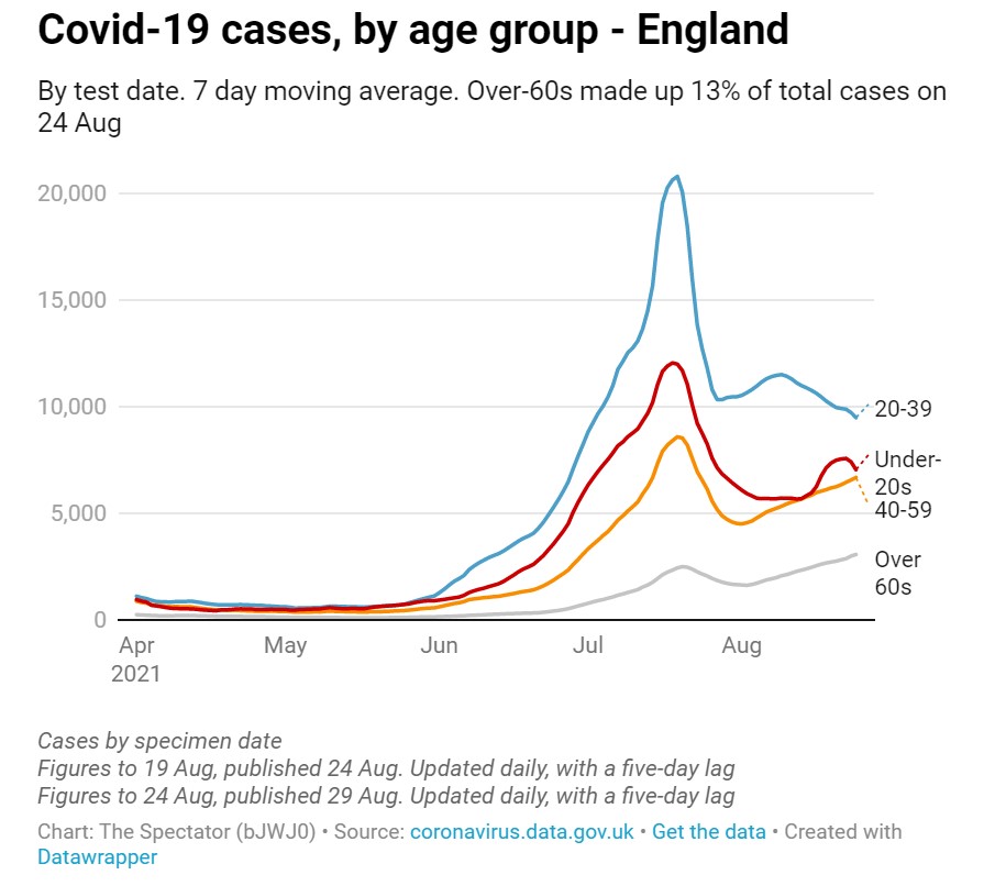 It’s instructive to break down the recent trends in England by age. Trends in different ages were very similar until July 28th, at which point they diverged. The 20-40 age group abruptly started rising again, though then peaked again on August 9th and has been declining since. The under-20s slowed to a plateau, spiked from August 14th, peaked again on August 22nd and have been declining since. The over-40s on the other hand started rising again on August 2nd and are still going, despite being the age groups with the highest vaccination rates.