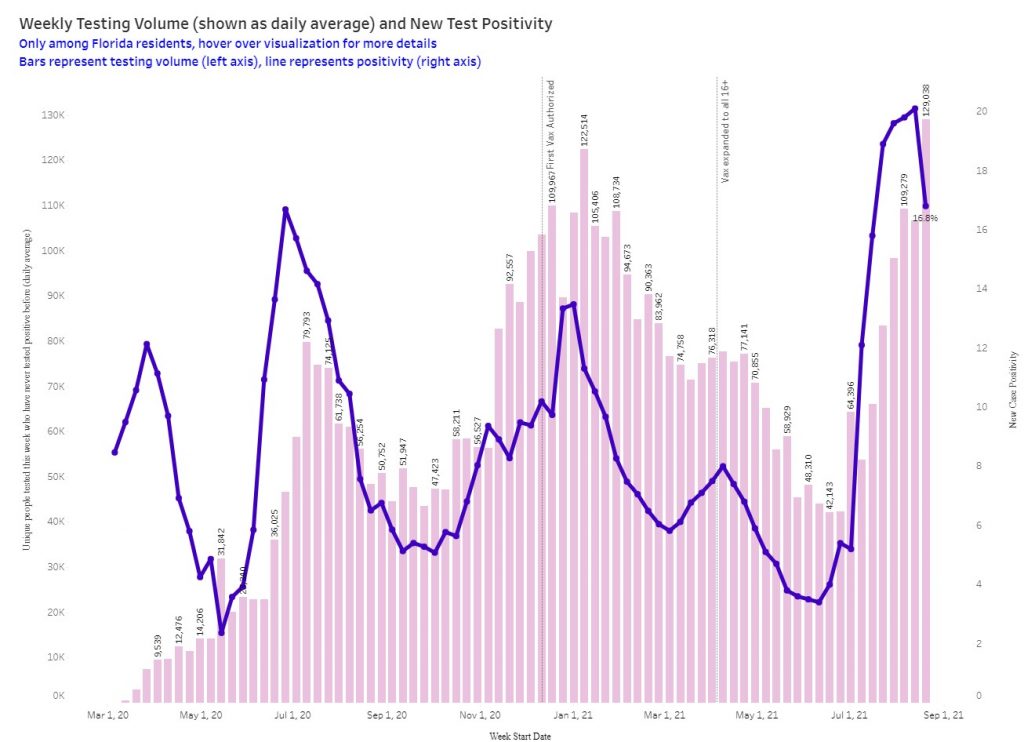 Florida’s reported infections have plateaued at a high level rather than declined so far – though it appears this is a result of increased testing. The positive rate dropped sharply last week, suggesting an epidemic in decline.