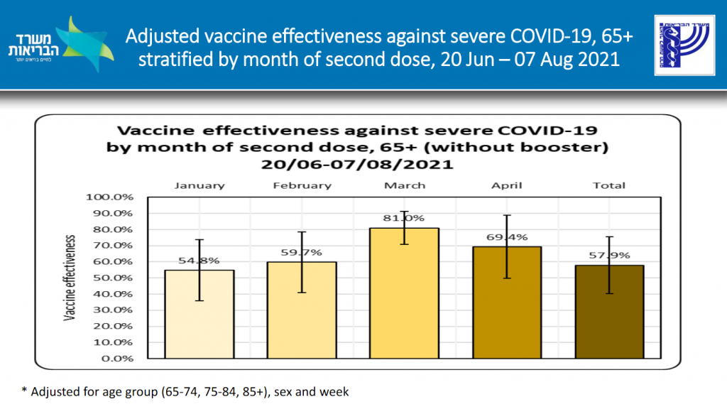 Data from the Israeli Government has suggested that vaccine effectiveness against serious disease in the over-65s has declined to around 55% in six months, which is one reason they are now rolling out boosters.