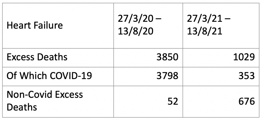 If the excess deaths were due to vaccines then presumably they took place among the younger members of the population as they are the people supposedly at risk. However, the total excess deaths from all causes in 0-24 age group in the period 27/3/21 to 13/8/21 was -28 i.e. 28 less than expected. So it seems almost certain that the excess deaths due to heart failure in this period fell almost entirely among older members of the population.