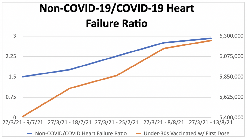 This correlation is concerning. As more young people are getting vaccinated, the ratio of excess non-COVID-19-induced heart failures rises. Something is causing this rise in mysterious heart failures, and it seems like this ‘something’ is correlated with the number of under-30s getting vaccinated.