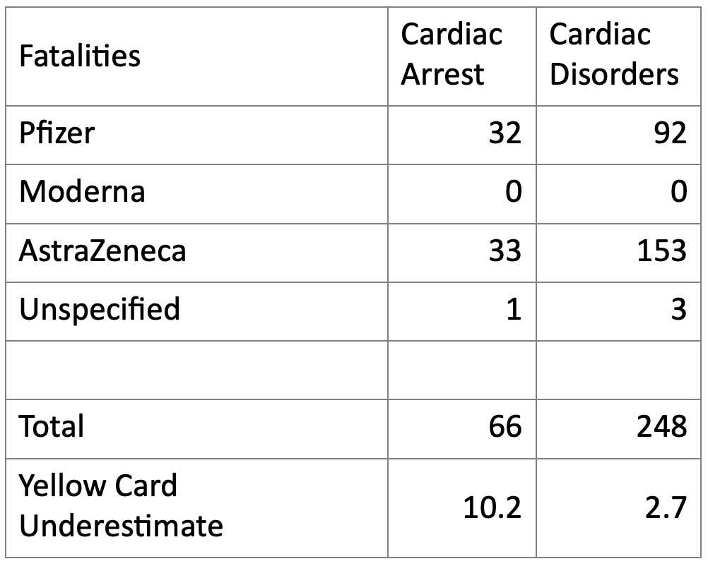 In the last line we have an estimate of how much the Yellow Card system might be missing deaths from vaccine-induced heart failure. As we can see, our numbers suggest that vaccine-induced heart failure deaths are over ten times higher than the Yellow Card system is capturing. Even if we are very conservative and we use the Yellow Card’s “cardiac disorders” categorisation, we are still detecting almost three times as many deaths as the reporting system.
