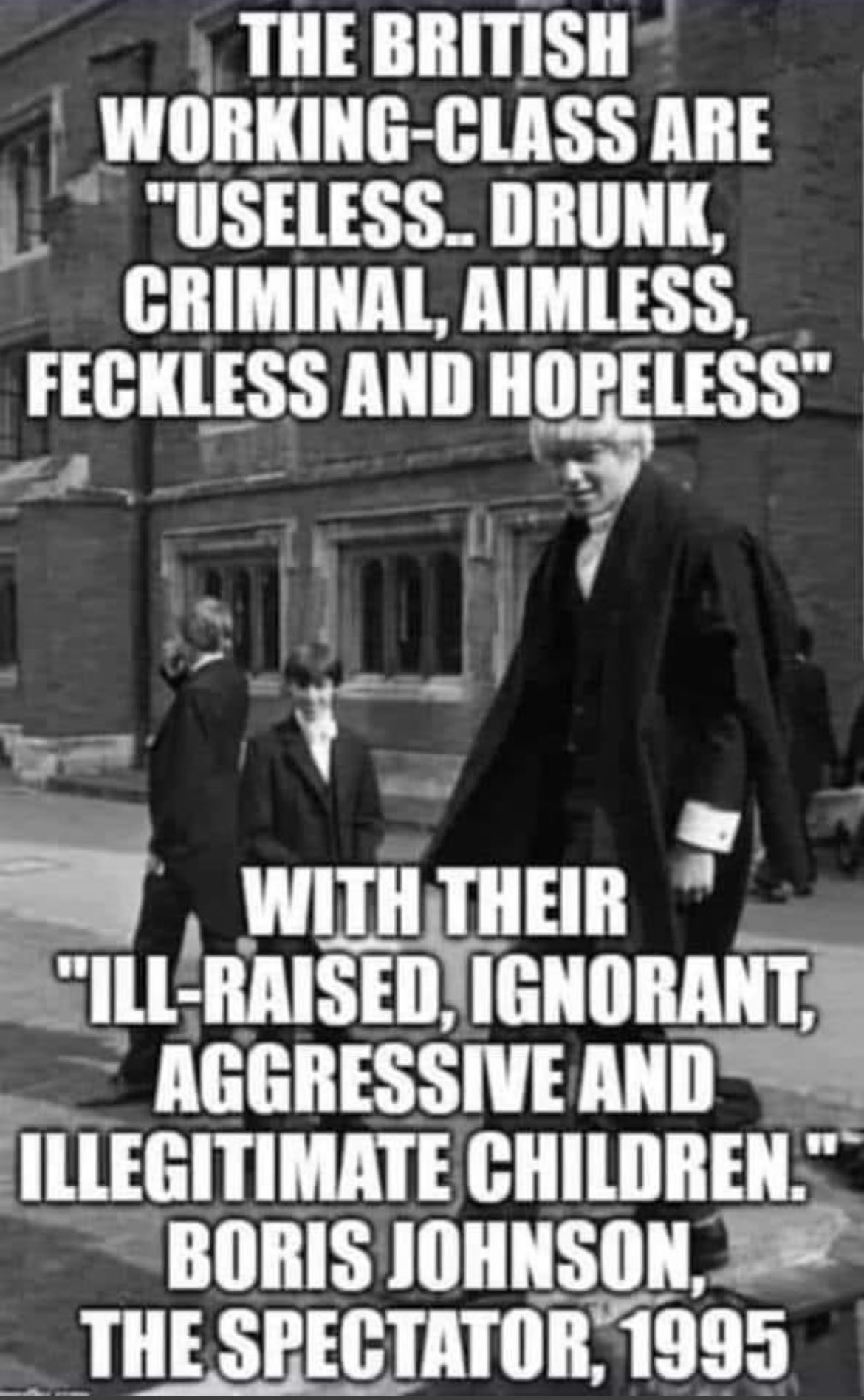 Behind the loveable, cheeky, bumbling act that Johnson has got down to a fine art over the years – occassionally that mask slips to reveal the real Boris Johnson underneath – this is the bigoted mindset we are dealing with here ….