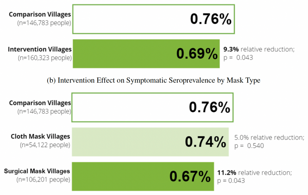 Among the intervention villages, some had been randomly assigned to get cloth masks, whereas others had been randomly assigned to get surgical masks. The researchers compared these two groups, and found that the reduction in seroprevalence was larger for the surgical mask group. They also found that the reduction was concentrated among individuals aged 50+ (see p.28).
