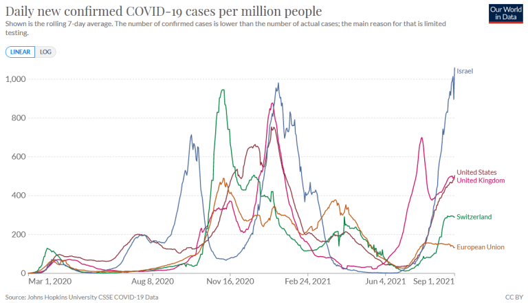 Israel is the only country so far to have rolled out third-jab boosters to the population, and as the ‘Swiss Doctor’ notes, it currently has the highest reported infection rate in the world.