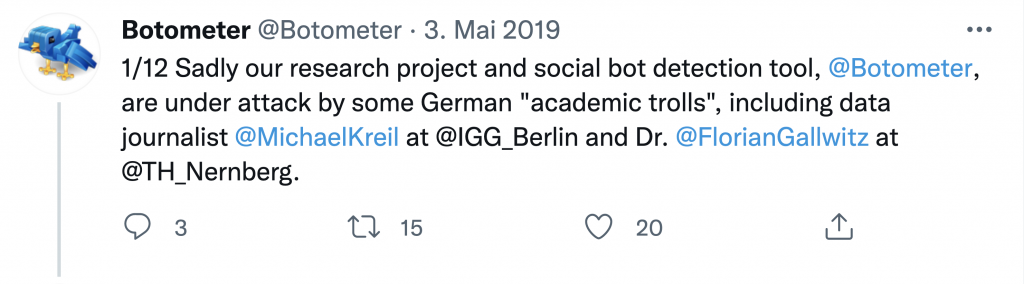 The developers of the Botometer know it doesn’t work. After the embarrassing U.S. Congress data was published, an appropriate response would have been retraction of their paper. But that would have implied that all the papers that relied upon it should also be retracted. Instead they hard-coded the model to know that Congress are human and then went on the attack, describing their critics as “academic trolls”: