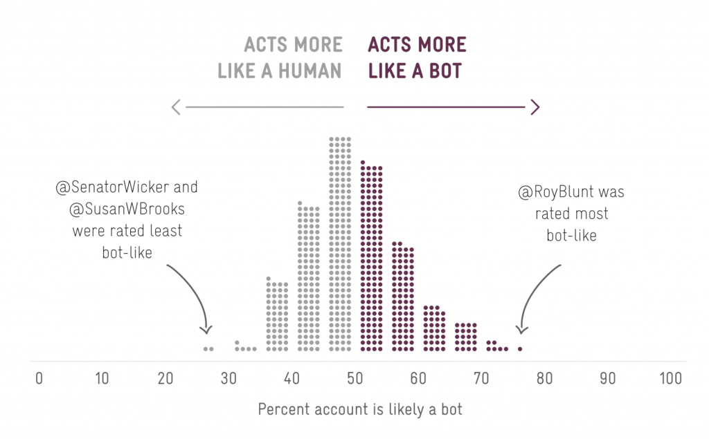 That claim is false. The Botometer’s false positive rate is so high it is practically a random number generator. A simple demonstration of the problem was the distribution of scores given to verified members of U.S. Congress:
