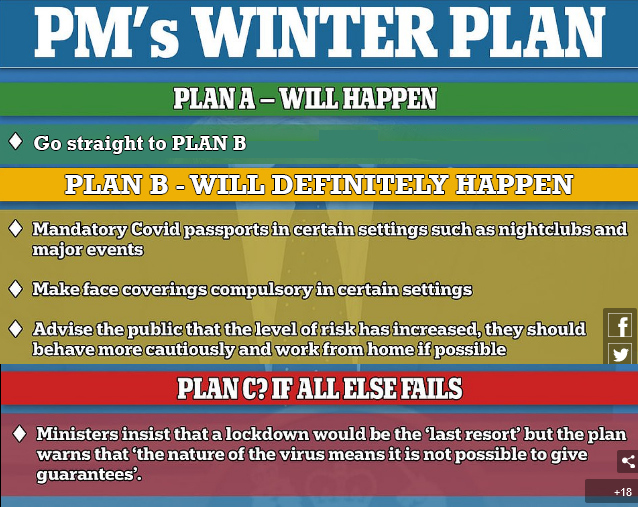 Just days after it led the public into believing that plans for vaccine passports were off the table, the Government has announced that they will be introduced – along with mask mandates and potentially another full lockdown – if booster jabs and vaccines for healthy teenagers fail to keep Covid infections down this winter. Laying out its new plans, the Government said it is “committed to taking whatever action is necessary to protect the NHS”. MailOnline has the story.