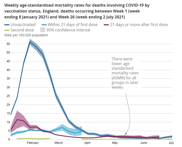 In the first study of deaths by vaccination status, the ONS found that around 99% of COVID-19 deaths between January 2nd and July 2nd 2021 were in people who had not had two doses.