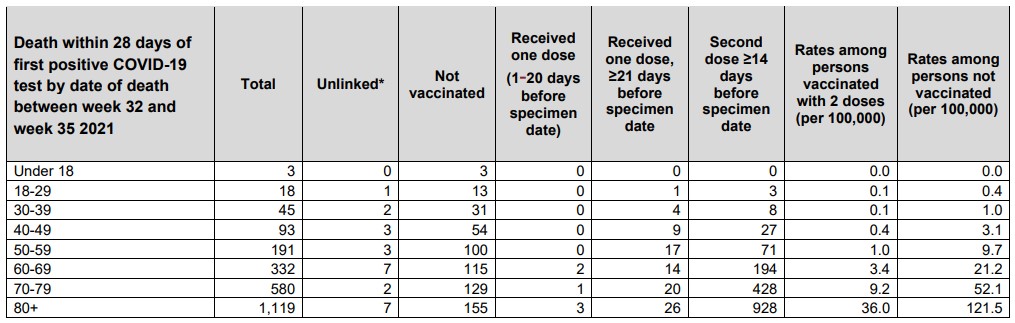 Public Health England published a report last week which gave us this data for the period of August 9th to September 5th. Here is the table of deaths broken down by vaccination status and age.
