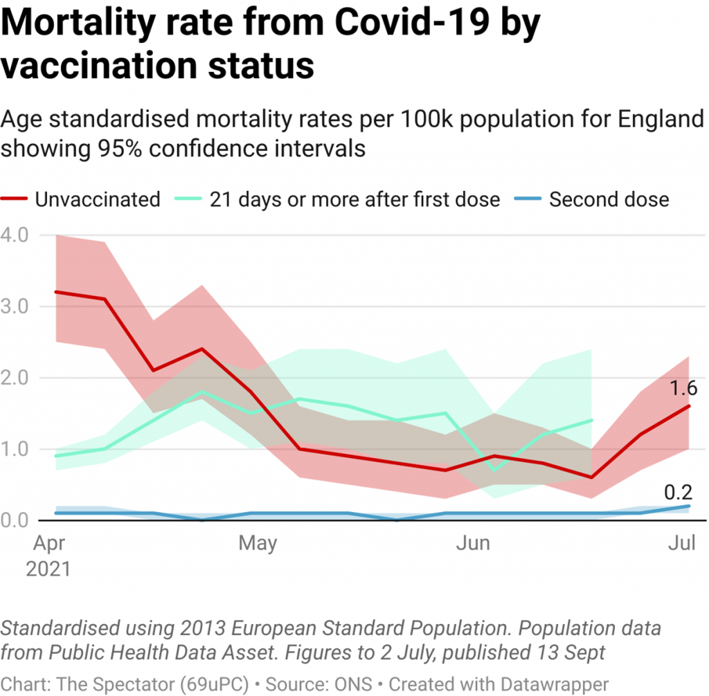 These statistics appear remarkable – until you realise what they’ve done. Although the data is presented as “this year” in fact the cut-off date is July 2nd. That is significant because it is just before the Delta surge got going. This means the data all comes from the Alpha surge, when almost no-one was vaccinated and tens of thousands of Covid deaths were reported, and from the quiet spring and early summer when many were vaccinated but almost no-one died (see chart below).
