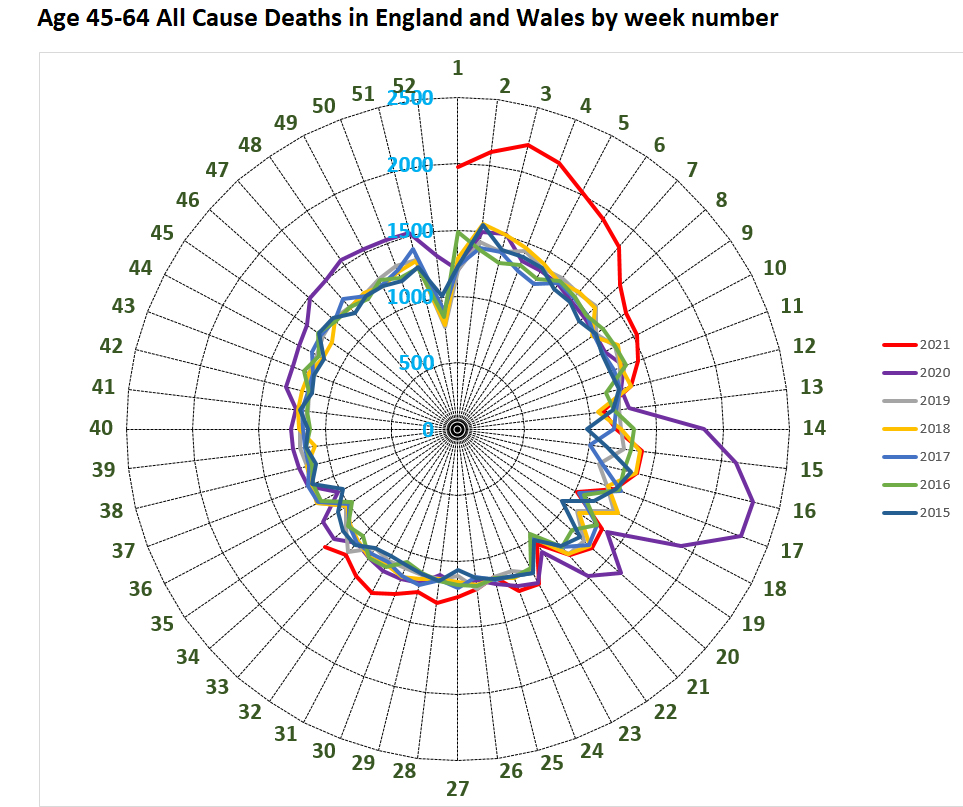 And these high levels of deaths are apparent in every adult age group. In particular in the age 45-64 age group you can see from the attached chart (again before today’s data) how all cause mortality varies little in the Summer and how abnormal Summer 2021 is.