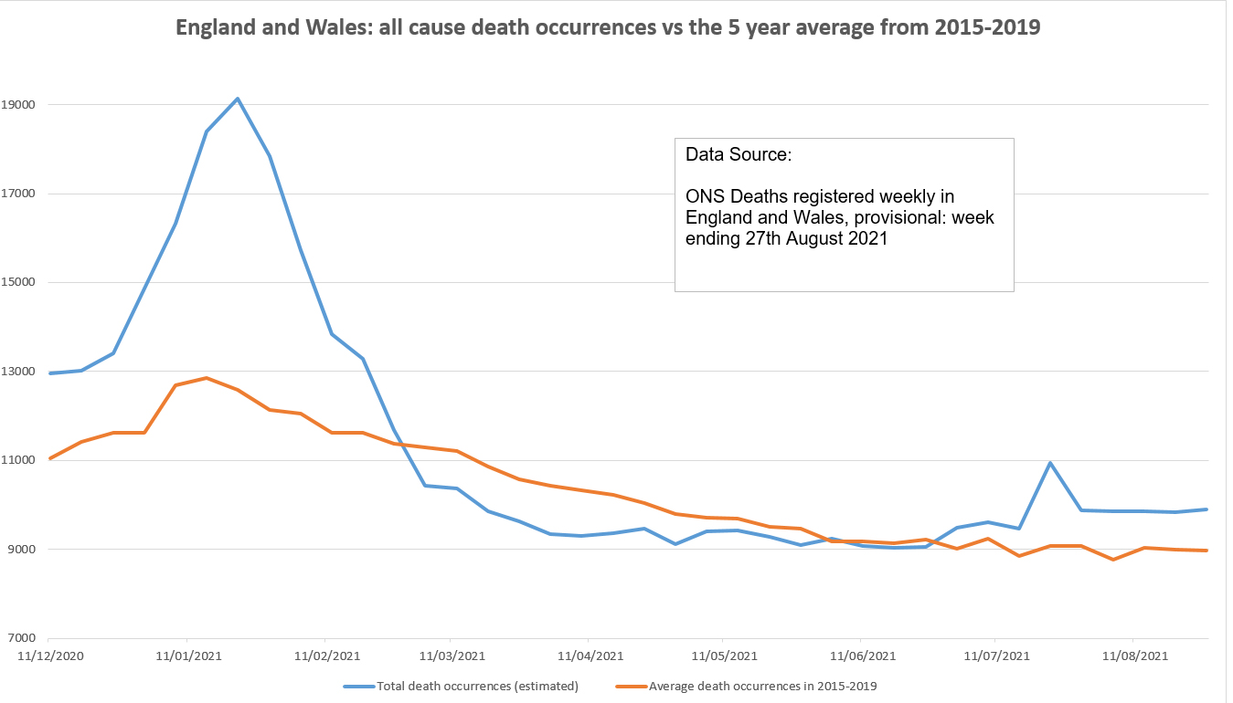 Here is a chart from the ONS data (prior to today’s publication due out in the next hour) based on all cause death occurrences in England and wales showing how it is trending above the 2015-2019 average