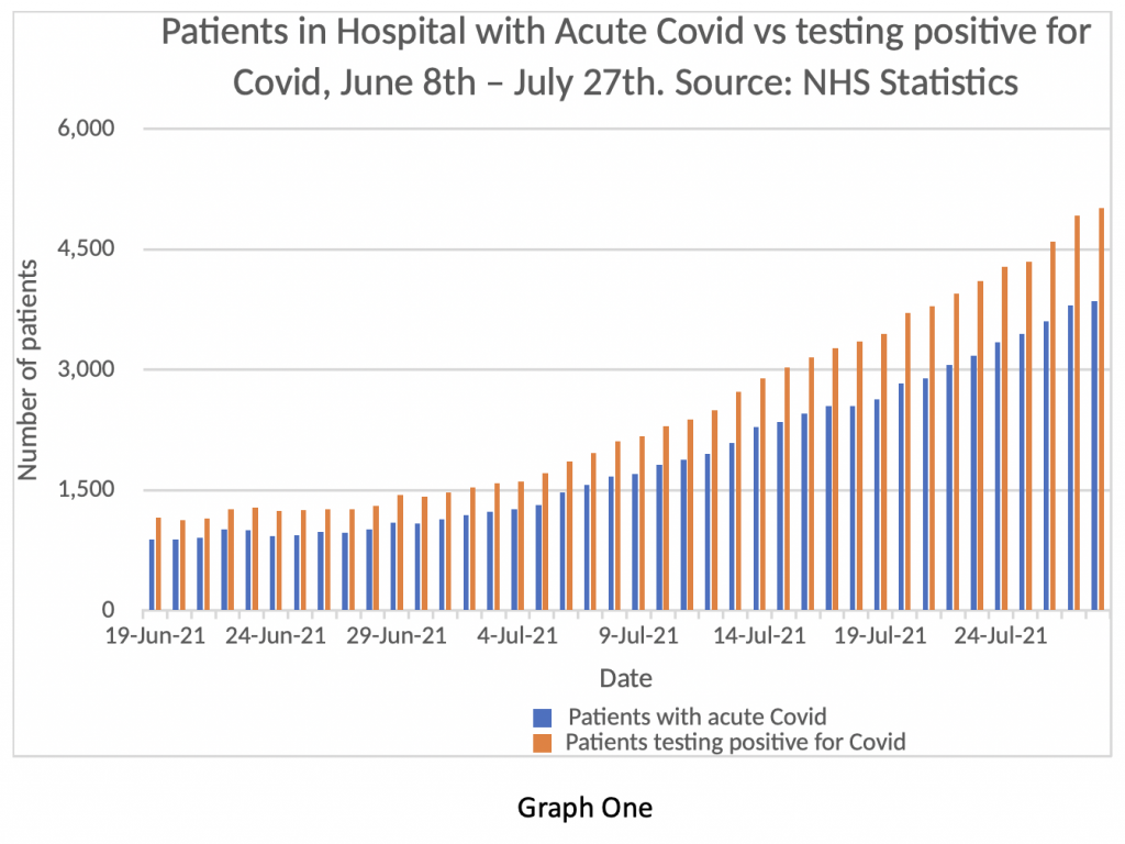Yesterday was an exception. Placed down at the bottom of the page, almost like a footnote, was a “Primary Diagnosis” Supplement. Graph One shows the information contained in that spreadsheet. I find it astonishing. In essence, it shows that since June 18th, the NHS has known its daily figures in relation to ‘Covid inpatients’ were unreliable at best and deliberately untrue at worst.
