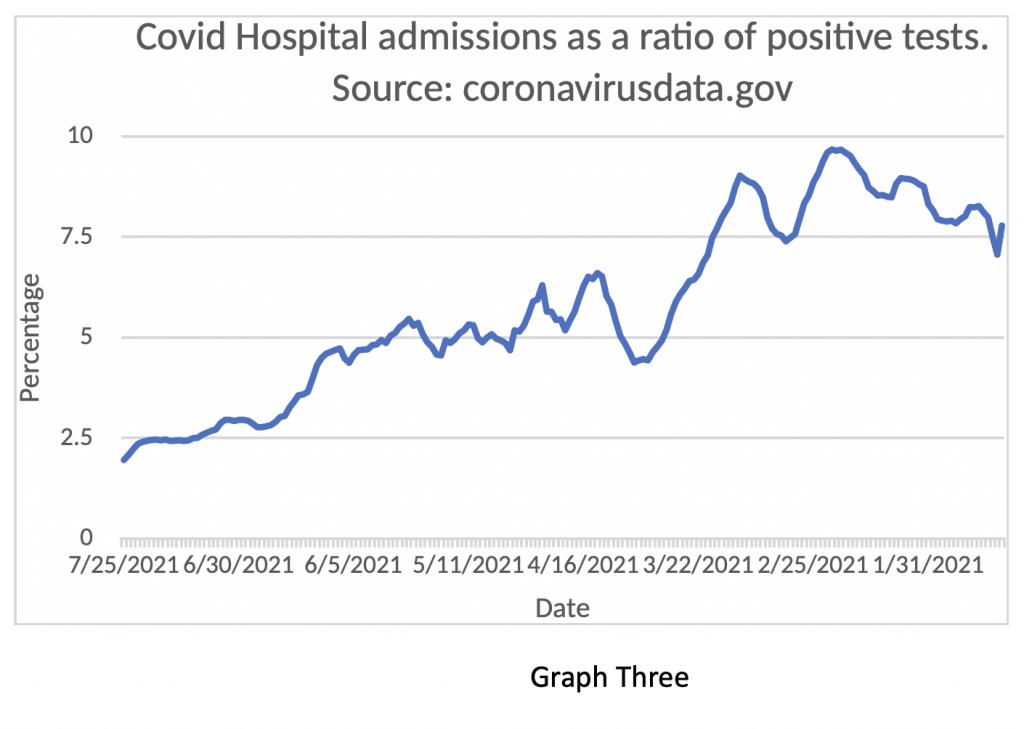 Supporting this finding is Graph Three. showing the fall in Admissions in relation to positive tests – in February, about 10% of people testing positive ended up in hospital. Now only 2% do – in essence, Graph Three shows that the risk of someone ending up in hospital with Covid has fallen by 80% from the peak number in February.