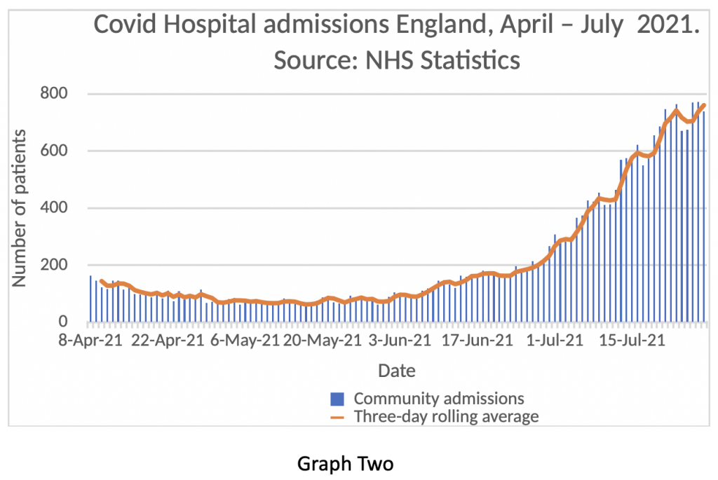 In previous posts, I have preferred to look at daily admissions from the community, rather than the figures for patients diagnosed in hospital, based on my suspicion that the data was manipulated. As readers will know, the number of positive tests in the community has been falling for the last week. Graph Two shows daily admissions to hospitals from the community on the blue bars and the three-day rolling average on the orange line.