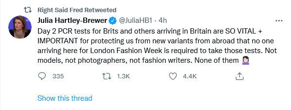 Unless you happen to be a part of the privilege elite then tests do not apply to you … photographers, models, fashion writers all exempt from tests when arriving in Britain for London Fashion Week – very clever these modern viruses …. they can differentiate betwen us plebs and the new globalist aristocracy …