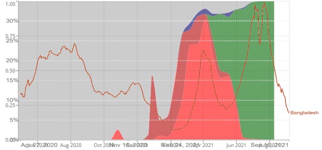 Bangladesh, on the other hand, has had two peaks in 2021, a spring peak associated with the Beta variant (light red) and a summer one associated with the Delta variant.
