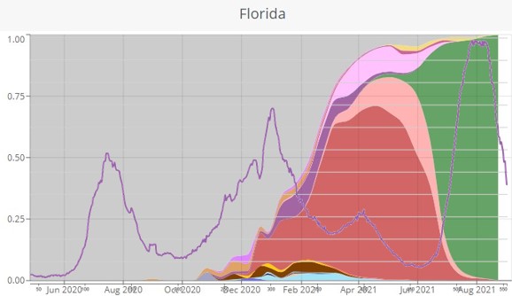 Florida lifted restrictions in autumn 2020 and went through the winter with no state-level restrictions. Yet its winter wave peaked and declined just like those in lockdown states. There was a small peak in the spring, but this was associated with the Alpha variant (dark red), not with the lifting of restrictions. This too declined, before the appearance in summer of a large surge associated with the Delta variant, which is now in decline. The imposing or lifting of restrictions played no part in this pattern, which is very similar to elsewhere.