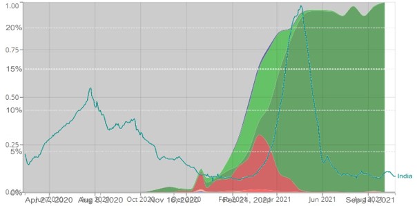 India has had one large surge in 2021 so far, occurring in spring and associated with the Delta variant (which was first identified there; in dark green). It has had no summer surge, and no new variant since.