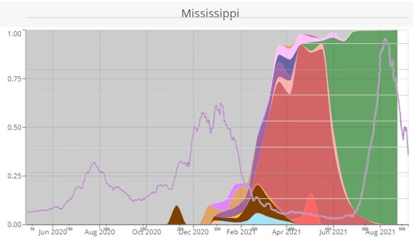 Mississippi also lifted restrictions in March and saw no new surge, with only the slightest bump in the spring being discernible, associated with Alpha. Come summer, however, and there is a big surge associated with Delta, now in decline.