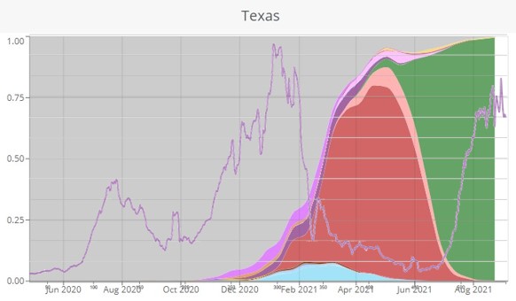Texas had a large winter wave, after which the state lifted restrictions in March, which led to no new surge. A slower decline in spring might be associated with Alpha but there is no clear peak. Come summer, however, and there is a big new surge associated with the arrival of Delta.