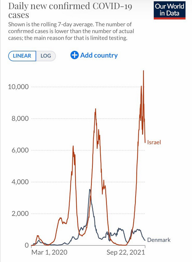 The Danes lifted all COVID restrictions two weeks ago and guess what? SARS Cov2 infections have fallen by 50% in ten days. Israel on the other hand…one of the most vaxxed nations on the planet recently had a huge spike in Covid infections despite grinding on with draconian restrictions throughout this summer.