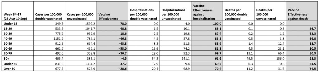 It shows that in the two weeks since my article the vaccine effectiveness has dropped further, with unadjusted vaccine effectiveness in the over-40s now hitting as low as minus-53% among people in their 60s. This means that, on this data for this age group, the double vaccinated experienced a 53% higher reported infection rate than the unvaccinated in the past month. And that’s a fact.