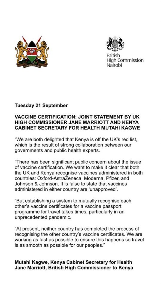 A joint statement on 21st September by Jane Marriot, Britain’s High Commissioner to Nairobi, and Kenya’s Health Cabinet Secretary Mutahi Kagwe, announced plans for a “system to mutually recognise each other’s vaccine certificates for a vaccine passport programme for travel”. Unfortunately, since the U.K. refuses to recognise vaccine certificates issued by Kenya, travel between the two countries is cumbersome and needlessly expensive.