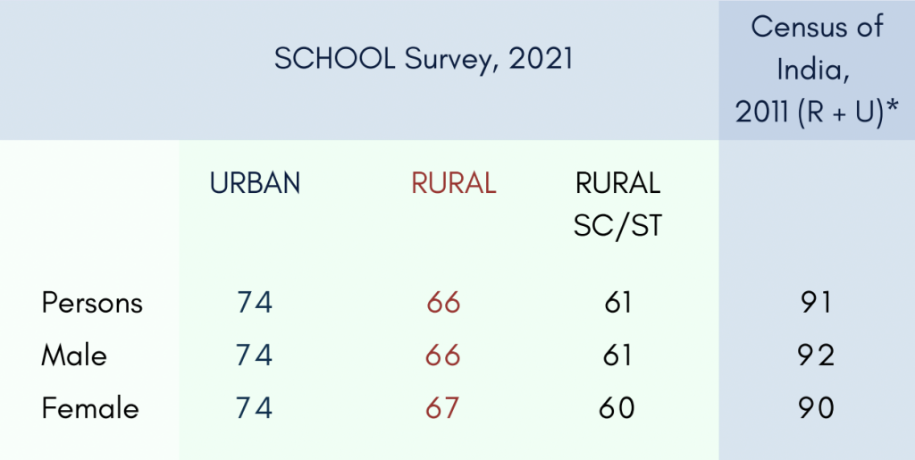 The table below gives the percentage of literate children aged 10–14 in different groups, as well as the corresponding figures from the 2011 census. Values in the census column are population-weighted averages of the figures for the 15 states covered by the survey.