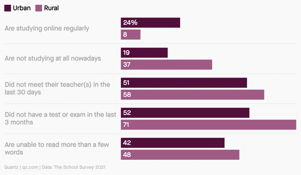 As the chart indicates, 37% of children from rural households were not studying at all when the survey was taken, and almost 60% had not met their teacher in the last month.