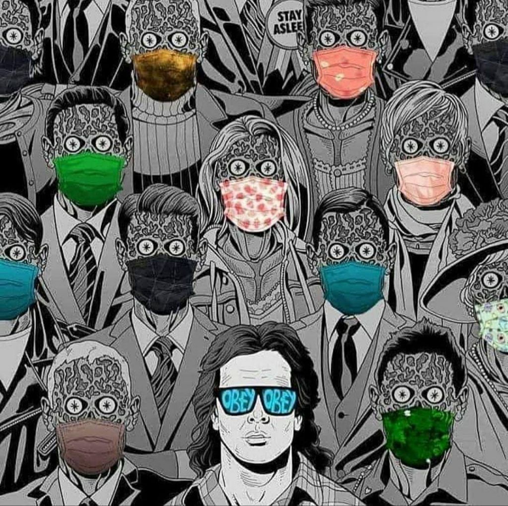 Problem with the image is that in the movie, They Live, the alien people are those in power. They were something more akin to Zionists and/or Freemasons. The mask wearers we encounter in everyday life are more like victims in the movie Invasion of the Body Snatchers. It’s like they’ve got an alien parasite latched onto their brains, telling them what to think.
